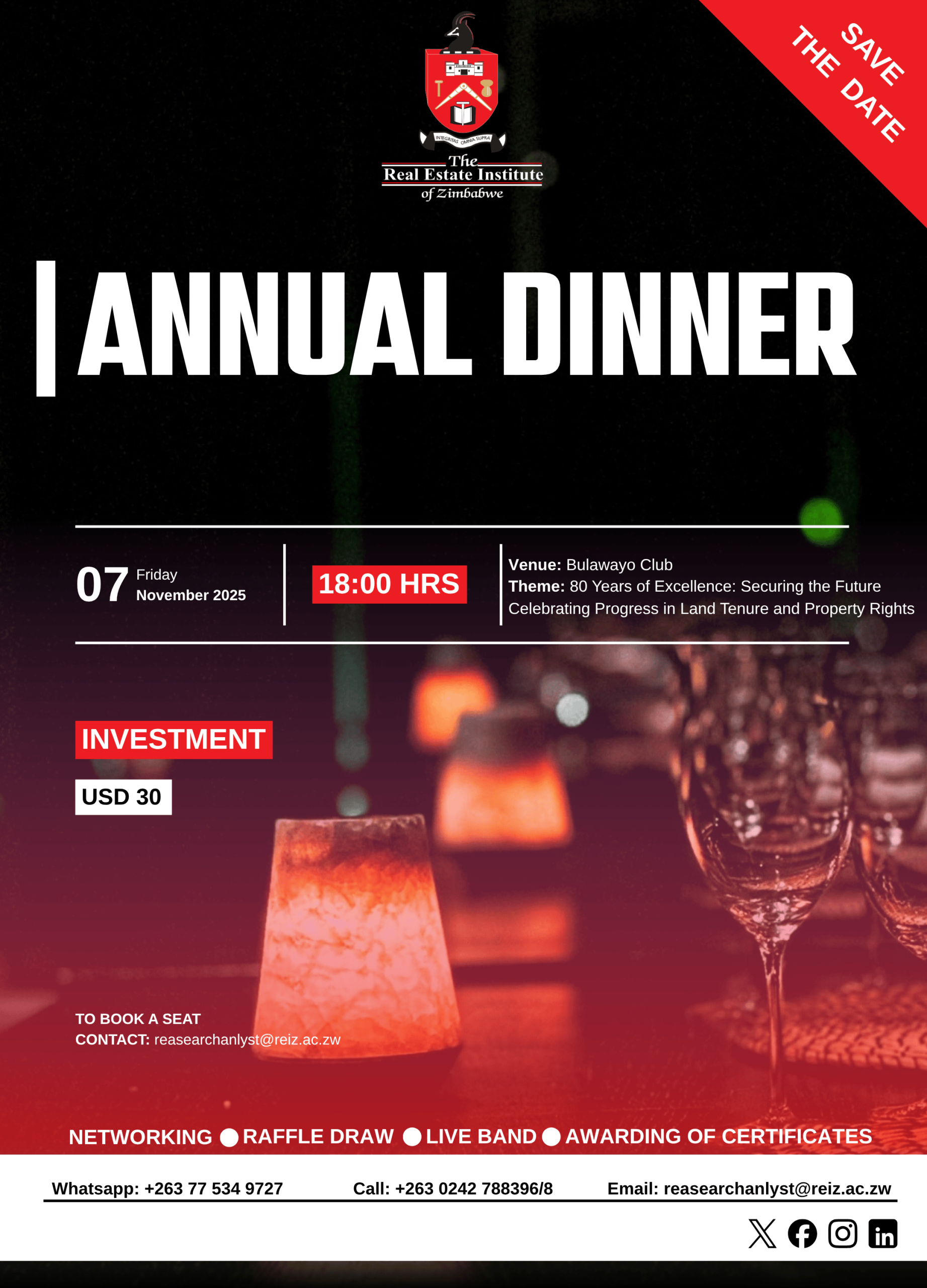 The Real Estate Institute of Zimbabwe (REIZ) invites you to an unforgettable evening of celebration, reflection, and connection at the Annual Dinner in Bulawayo.